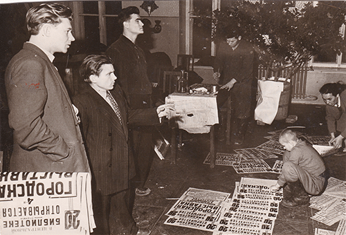 Подготовка к 4-й городской художественной выставке. Второй слева – Николай Яковлевич Лисименко со студийцами, справа (сидит в углу) – заведующая отделом культуры горисполкома Нинэль Афанасьевна Павленко. Библиотека им. А.С. Пушкина. 1958.