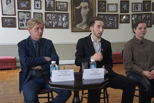 Предпремьерный показ 23 апреля завершился пресс-конференцией, где режиссер-постановщик ответил на вопрос о выборе темы и сегодняшней актуальности спектакля, о времени больших надежд на заре строительства нового мира